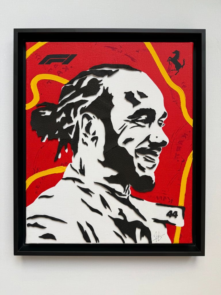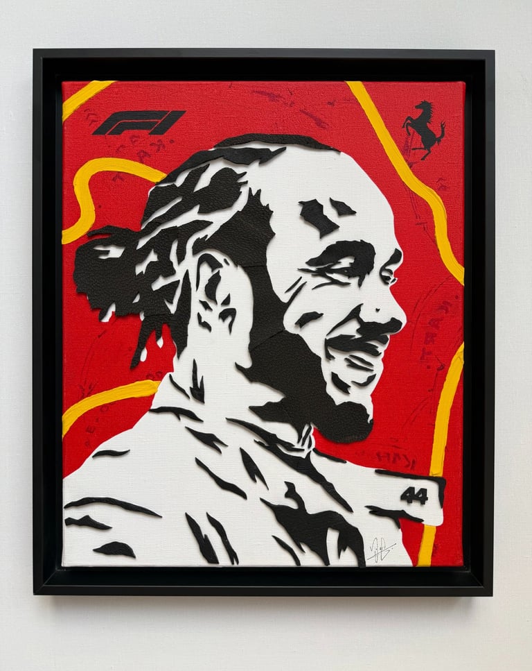 L’œuvre met en avant Lewis Hamilton, septuple champion du monde de Formule 1, représenté ici aux couleurs de sa nouvelle écurie Ferrari.