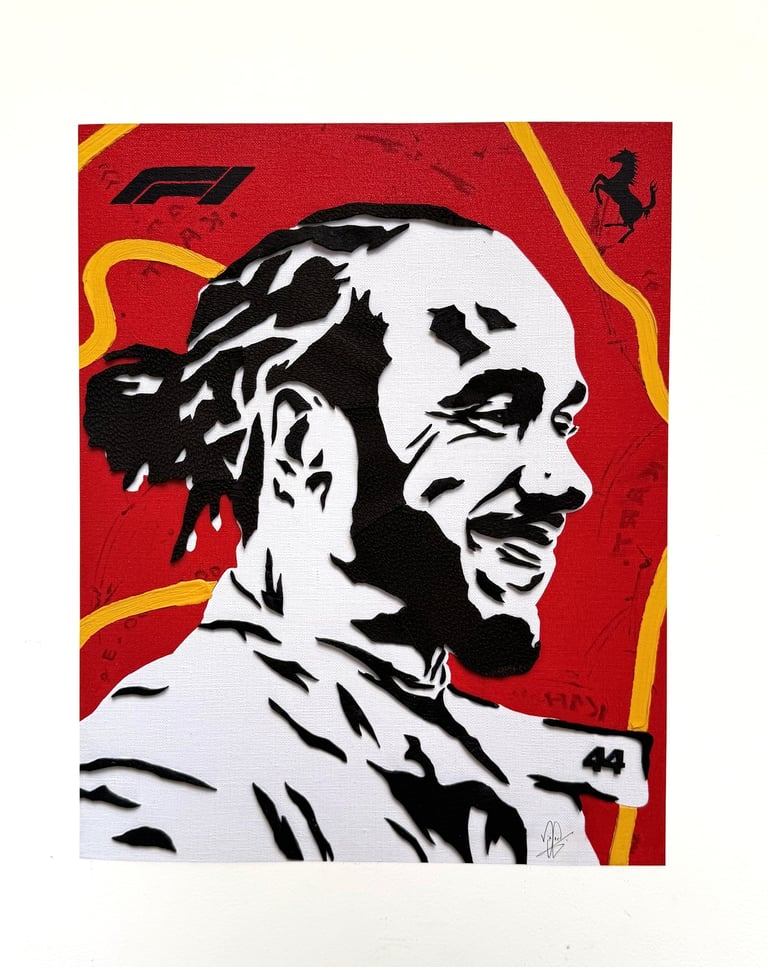 L’œuvre met en avant Lewis Hamilton, septuple champion du monde de Formule 1, représenté ici aux couleurs de sa nouvelle écurie, Ferrari.