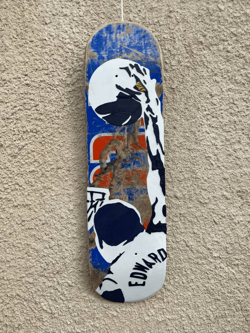 Après avoir utilisé le jaune de cette dunk low Michigan pour un tableau me voilà utiliser le bleu pour ce tableau. La planche de skate rouge et bleu crée un contraste saisissant avec le bleu marine des pièces de la chaussure, accentuant l’impact visuel de la scène. Chaque pièce collée, intègre les détails de la Dunk Low, y compris le logo Nike, soulignant ainsi la dimension symbolique de la chaussure dans l’univers du basketball.