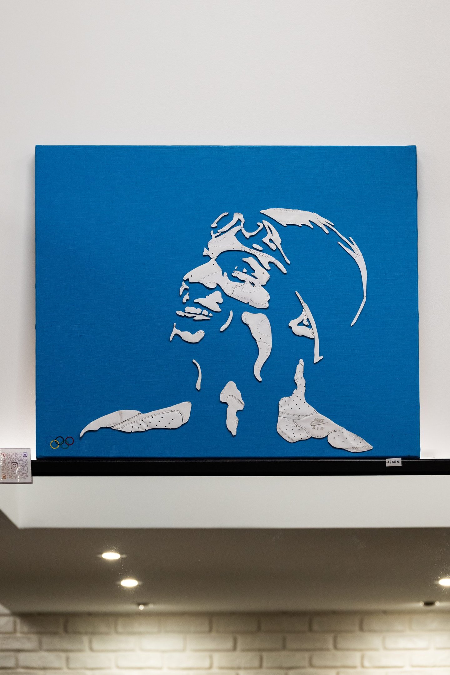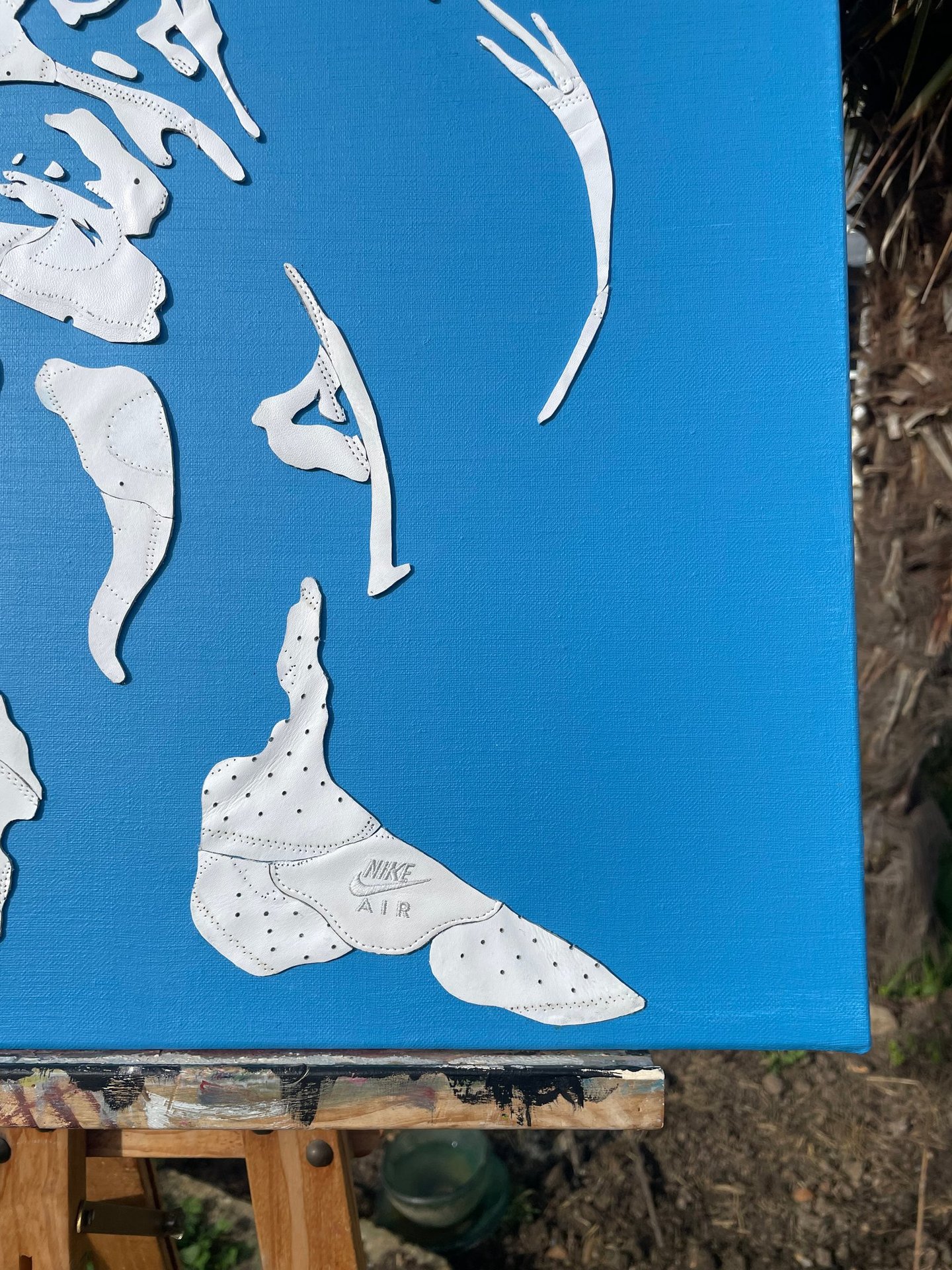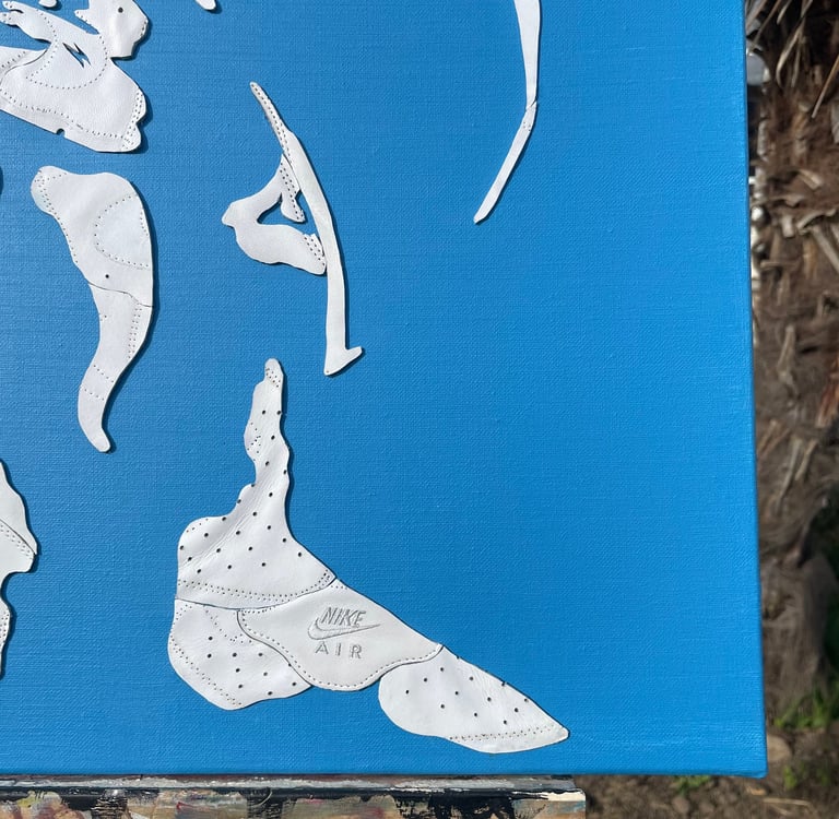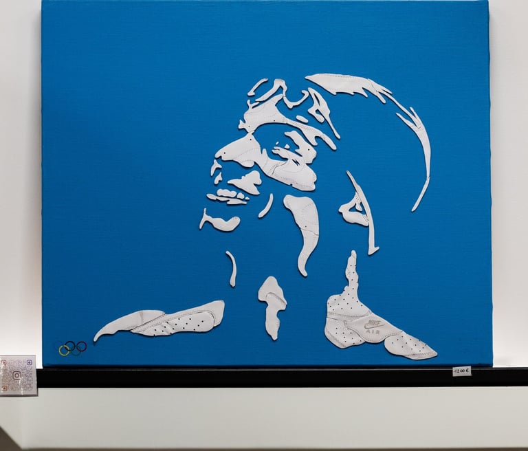 J’ai utilisé une paire d'Air Force 1 blanche pour réaliser ce portrait, associée à une toile bleu profond, référence à son terrain de jeu : la piscine. Le travail a été minutieux, chaque pièce découpée et collée pour retranscrire son image. Cette œuvre a été achevée le 03 avril 2024, avant ses succès internationaux.