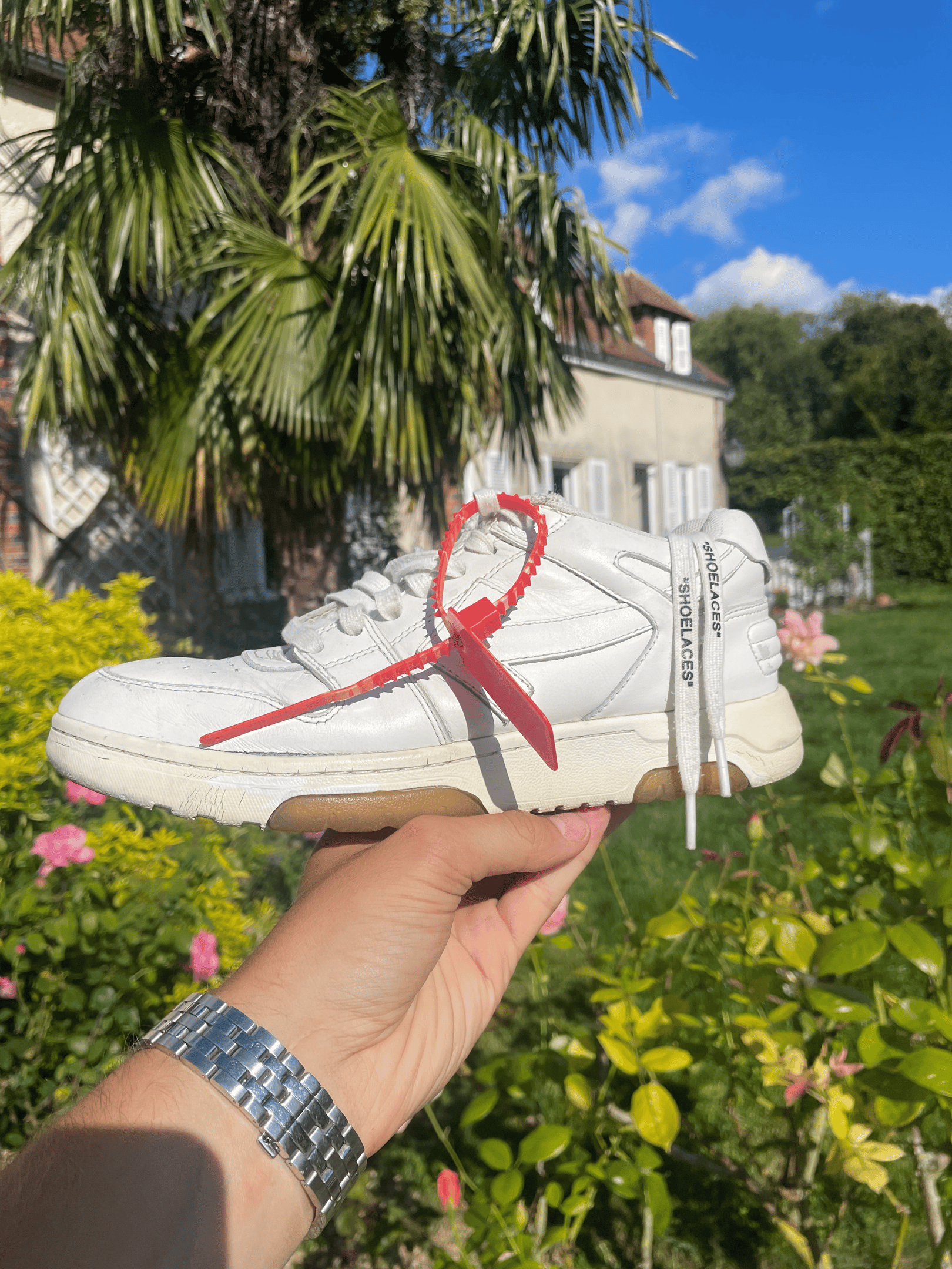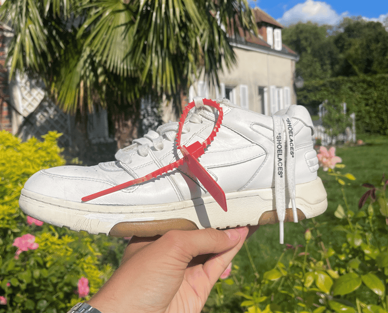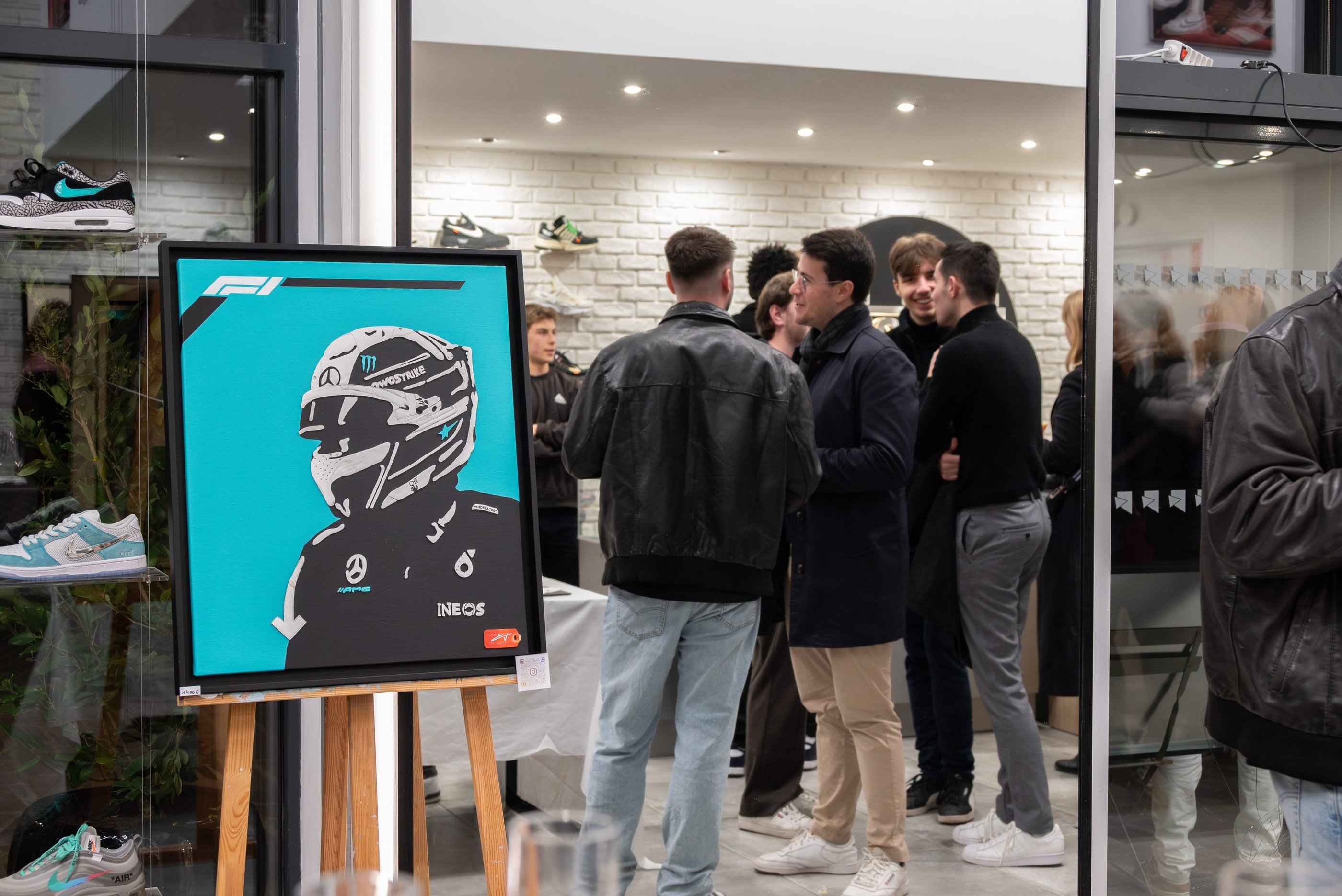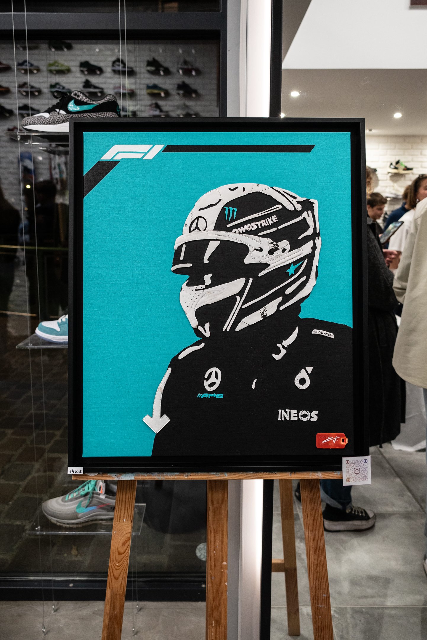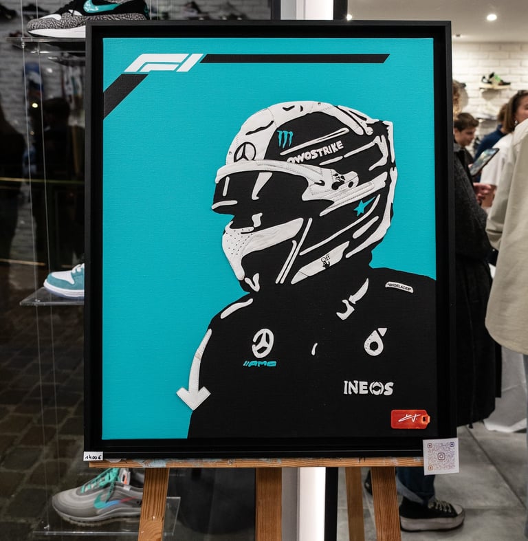 Pour réaliser ce portrait unique, j’ai utilisé une paire de Off-White Out of Office White, une des chaussures que Lewis Hamilton possède dans sa garde-robe. Certaines pièces blanches ont été minutieusement peintes en bleu turquoise, créant des diagonales dynamiques au tableau. Le logo F1 en blanc trône fièrement en haut de l’œuvre, entouré de bandes noires qui évoquent les lignes des circuits de course. Le détail est poussé à son maximum : le logo Off-White est bien visible, et le célèbre tag rouge de la marque est collé en bas à droite, servant également pour la signature.