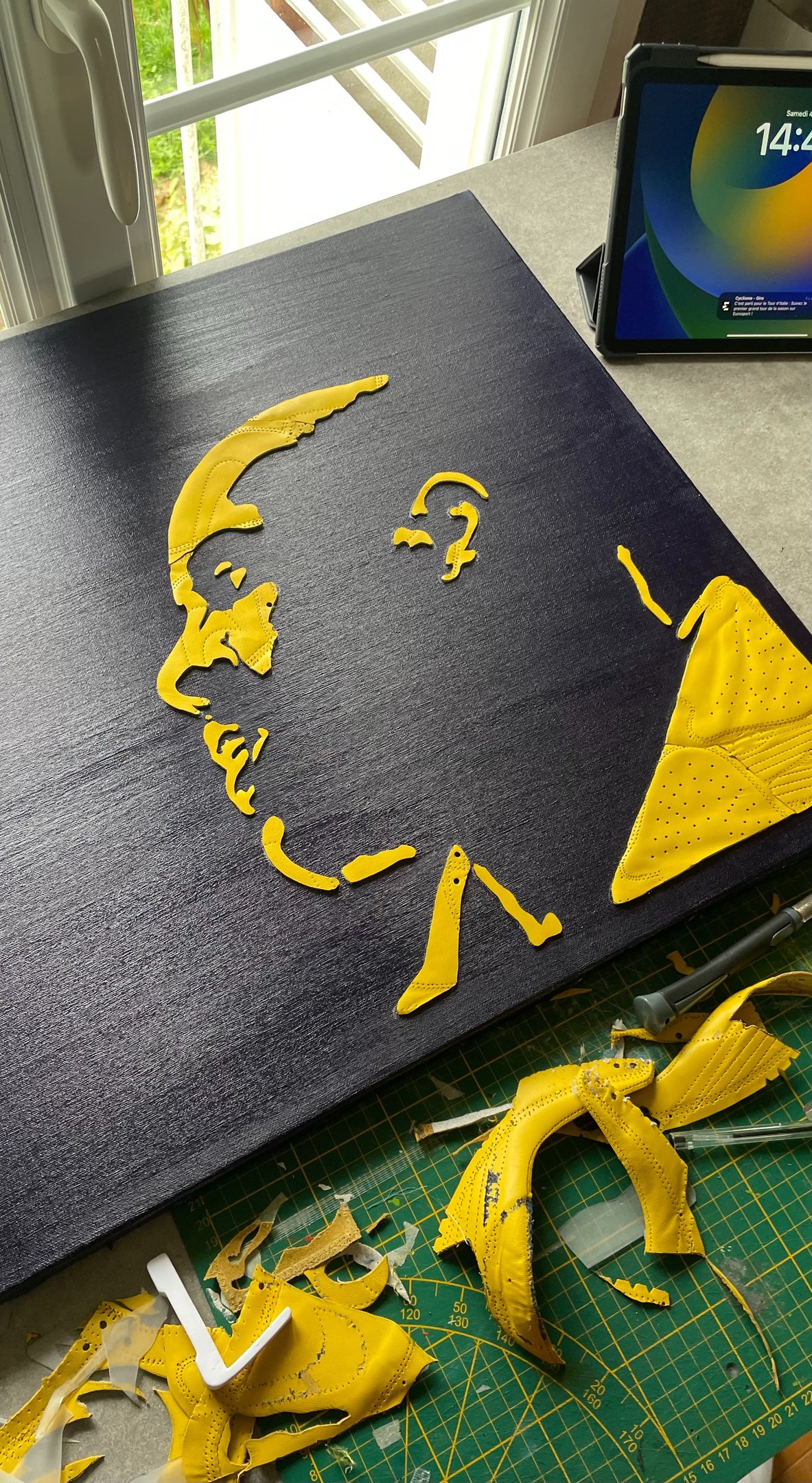 J'ai choisi d'utiliser le jaune éclatant d'une paire de Dunk Low Michigan pour symboliser son aura et son rayonnement mondial. Le contraste avec le fond bleu sombre accentue l’intensité de la scène et met en valeur la silhouette de Teddy.